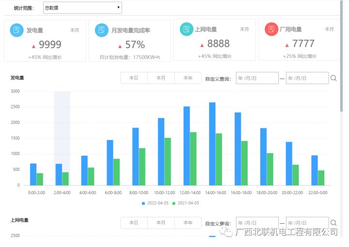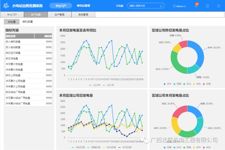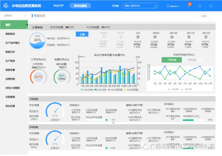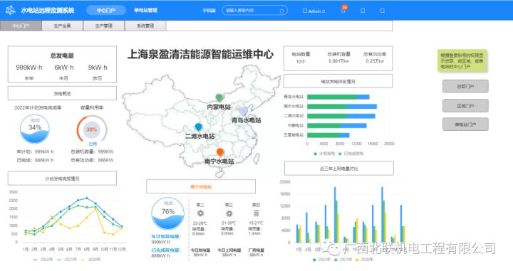 水電站分布位置、總發(fā)電量、計(jì)劃發(fā)電完成率、電站發(fā)電排名情況、電量對比等。